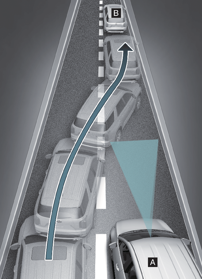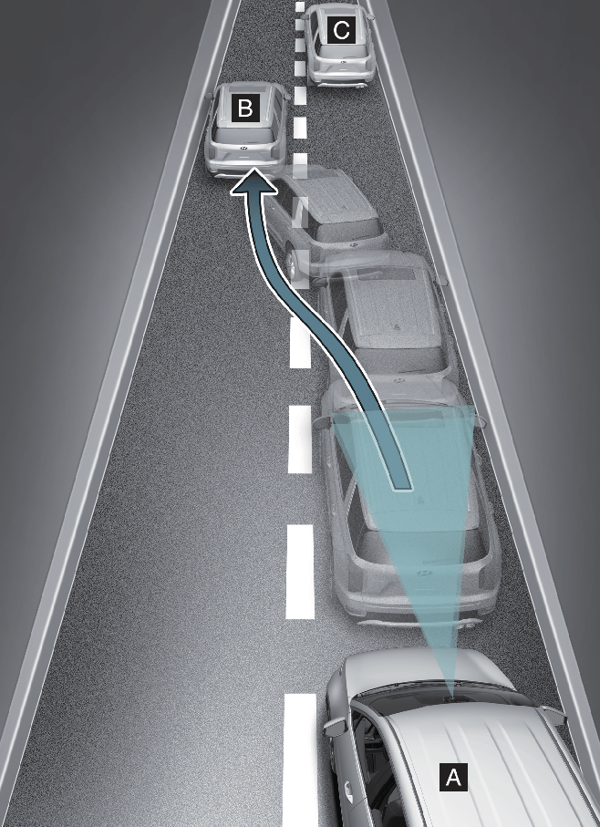 После перемещения транспортного средства (B) на вашу полосу с соседней полосы оно не будет обнаружено датчиком, пока не окажется в пределах дальности обнаружения датчика. Вспомогательная функция предотвращения лобового столкновения может не сразу обнаружить транспортное средство, резко меняющее полосу движения. В этом случае необходимо поддерживать безопасную дистанцию торможения и при необходимости управлять автомобилем и нажимать на педаль тормоза для снижения скорости движения с целью поддержания безопасной дистанции.