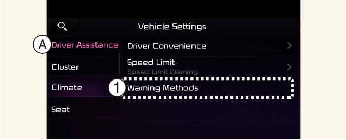 Виды предупреждений можно настроить, когда двигатель находится в положении «ON» (Вкл.). Выберите Настройки пользователя → Помощь водителю → Виды предупреждений в меню настроек в комбинации приборов или Настройки → Автомобиль → Помощь водителю → Виды предупреждений в меню настроек информационно-развлекательной системы, чтобы изменить следующие настройки: