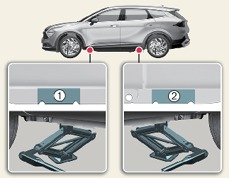 Установите домкрат на переднее (1) или заднее (2) обозначенное место для установки домкрата.