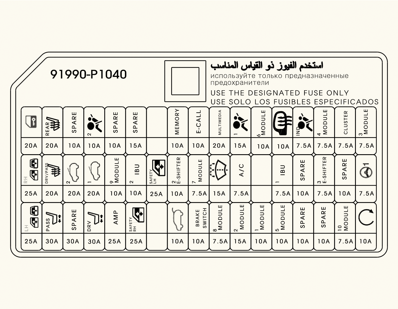 На внутренней стороне крышки панели предохранителей/реле находится табличка с указанием наименования и номинальных параметров предохранителей/реле.