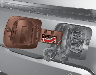 Hvis ladestiklåsen ikke åbnes, selv efter at dørlåsen er blevet frigivet, skal du bruge nødudløserhåndtaget i motorrummet og trykke på udløserknappen for ladestiklåsen (1) for at frakoble ladestikket. Hvis dette sker, kan ladestikkets låsefunktion have et problem, Kia anbefaler, at du får dit køretøj efterset af en autoriseret Kia-forhandler/servicepartner.