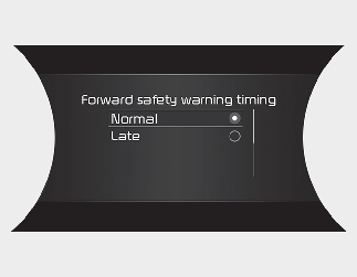 Med køretøjet tændt skal du vælge Indstillinger → Førerassistentsystem → Kørselssikkerhed → Advarselstiming for Sikkerhed forude på instrumentklyngen eller Indstillinger → Køretøj → Førerassistentsystem → Kørselssikkerhed → Advarselstiming for Sikkerhed forude på infotainmentsystemet for at ændre den indledende advarsel aktiveringstidspunkt for Assistent til fremadrettet kollisions-undgåelse.