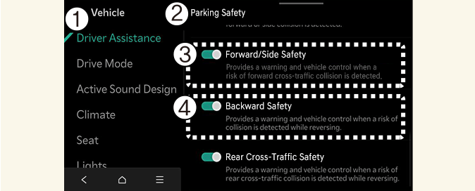 Η Μετωπική/πλευρική ασφάλεια είναι διαθέσιμη μόνο όταν έχει επιλεγεί η πίσω ασφάλεια. Η πίσω ασφάλεια ορίζεται ως προεπιλογή όταν το αυτοκίνητο τίθεται σε λειτουργία και η μετωπική/πλευρική ασφάλεια ορίζεται στην προηγούμενη επιλογή.