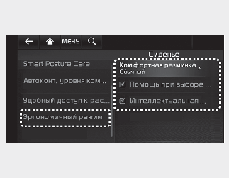 «Setup» (Настройка) -> «Vehicle Settings» (Настройки автомобиля) -> «Seat» (Сиденье) -> «Ergo-Motion Seat» (Сиденье Ergo-motion) -> «Comfortable Stretch» (Растяжка) -> «Strong/Normal» (Высокая/Обычная).