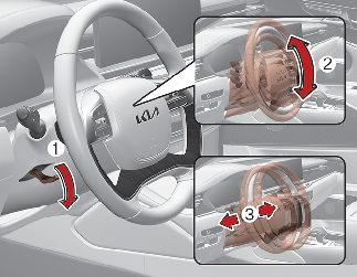 С помощью управляющего переключателя (2) изменяйте угол наклона рулевого колеса (3) и его положение (1). Запрещается регулировать положение рулевого колеса во время движения.