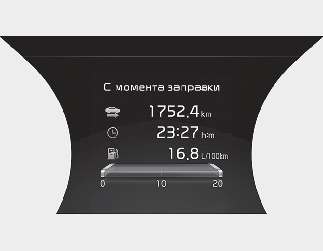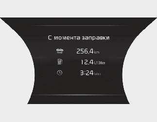 На дисплее отображается общее пройденное расстояние, средняя эффективность использования топлива и общее время в пути после заправки.