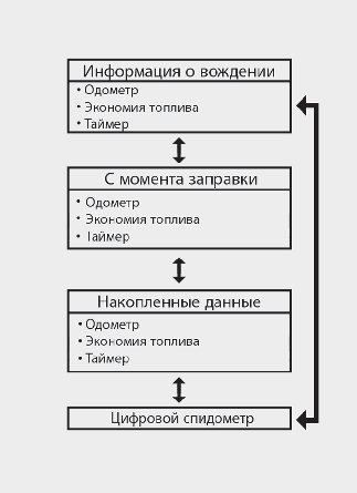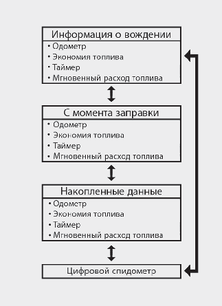 На дисплее отображается пройденное расстояние, средняя эффективность использования топлива и общее время в пути один раз в течение каждого цикла включения зажигания.