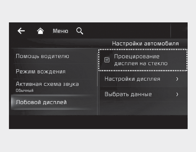 При включенном двигателе дисплей на ветровом стекле активируется или деактивируется в режиме пользовательских настроек на экране информационно-развлекательной системы.