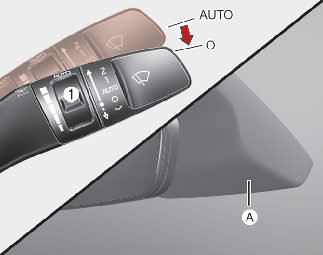 Датчика дождя (A), расположенный на верхней части лобового стекла, определяет количество осадков и регулирует интервал цикла очистки стекла. Чем сильнее становится дождь, тем быстрее работает стеклоочиститель. Когда дождь прекращается, стеклоочиститель останавливается.