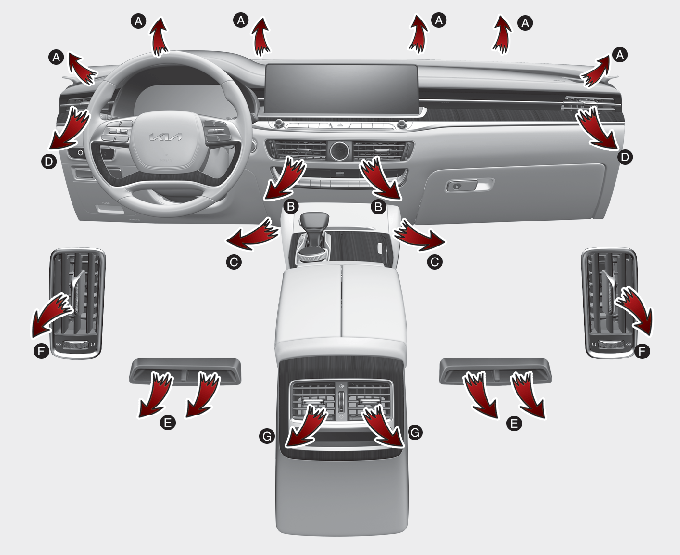 Поток воздуха, подаваемый через вентиляционные отверстия второго и третьего ряда (E, F), может быть менее интенсивным, чем поток из дефлекторов на приборной панели.