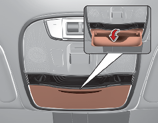 Чтобы открыть держатель для солнцезащитных очков, нажмите на его крышку, и она медленно откроется. Положите солнцезащитные очки стеклами наружу. Чтобы закрыть держатель, нажмите на крышку.
