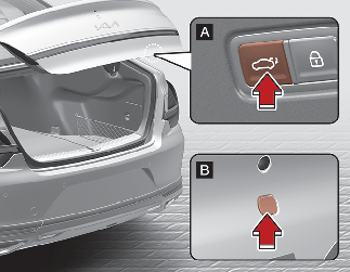 Удерживая кнопку закрывания двери багажника с электроприводом (A), нажмите кнопку открывания двери багажника (B) и удерживайте ее нажатой в течение не менее 3 секунд (раздастся звуковой сигнал).