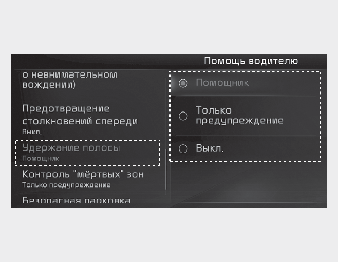 Если выбран пункт «Assist» (Помощь), функция удержания полосы автоматически выравнивает руль при обнаружении отклонения от полосы, чтобы предотвратить схождение автомобиля с полосы движения.