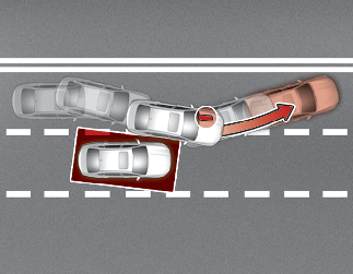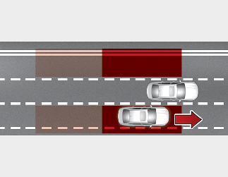 Если при перестроении существует риск столкновения с приближающимся транспортным средством в слепой зоне, функция предотвращения столкновения в слепой зоне поможет избежать данного столкновения, определяя полосу движения впереди автомобиля и применяя дифференциальное торможение.