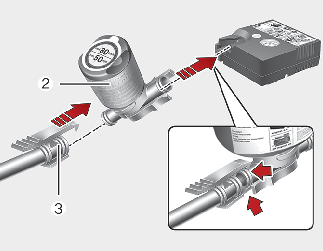 Подсоедините заливочный шланг (3) к горлышку емкости с герметиком (2).