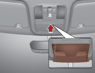 Чтобы открыть держатель для солнцезащитных очков, нажмите на его крышку, и она медленно откроется. Положите солнцезащитные очки стеклами наружу. Чтобы закрыть держатель, нажмите на крышку.