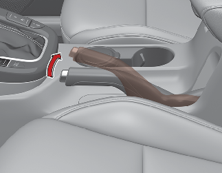 Для приведения в действие стояночного тормоза сначала нажмите на педаль ножного тормоза, а затем потяните рычаг стояночного тормоза как можно выше.