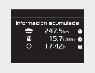 Muestra la distancia del recorrido acumulada (1), el consumo medio de combustible (2) y el tiempo total de conducción (3).
