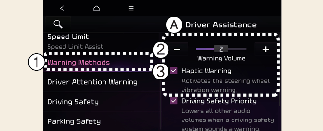 Heptičko upozorenje: Na infozabavnom sistemu izaberite Podešavanja → Vozilo → Pomoć vozaču → Postupci upozorenja → Haptičko upozorenje i podesite haptičko upozorenje.
