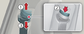 按下高度調整器按鈕 (2),然後將向下推壓高度調整器 (3)。