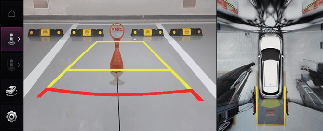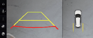 選擇前或後俯視停車指引時,全景監控畫面的右方會顯停車指引。