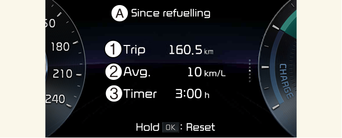 Para reiniciar la información manualmente, mantenga pulsado el botón OK en el volante mientras se muestra la Información después del repostaje.