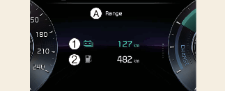 La autonomía es la distancia estimada que el vehículo puede recorrer con la batería (híbrida) de alto voltaje restante (1, Eléctrico) y el combustible en el depósito de combustible (2, Gasolina).