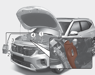أكمل توصيل الطرف الآخر لكبل بدء التشغيل بالطرف السالب للبطارية المعززة المانحة (٣)، ثم صل الطرف الآخر بنقطة معدنية متينة وثابتة (مثل ماسكات رفع المحرك) بعيدًا عن البطارية (٤) . لا تقم بالتوصيل على أي جزء متحرك ولا قريبًا منه عند تدوير المحرك.