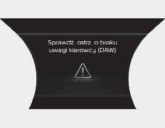 Gdy system powiadamiania o zmęczeniu kierowcy działa nieprawidłowo, w zestawie wskaźników pojawia się komunikat ostrzegawczy „Check Driver Attention Warning (DAW) system” (Sprawdź system powiadamiania o zmęczeniu kierowcy (DAW)). W takim przypadku zalecamy przegląd pojazdu u autoryzowanego dealera/partnera serwisowego marki Kia.