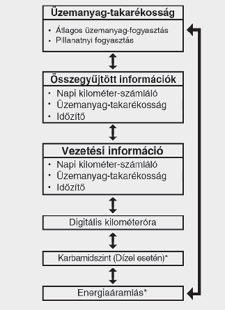 A rendszer az átlagfogyasztást a számláló utolsó visszaállítása óta megtett teljes távolság és elfogyasztott üzemanyag-mennyiség alapján számítja ki.