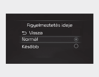 Válassza a 'Late' (Késő) figyelmeztetés-időzítési beállítást enyhe forgalom és alacsonyabb sebesség esetén.