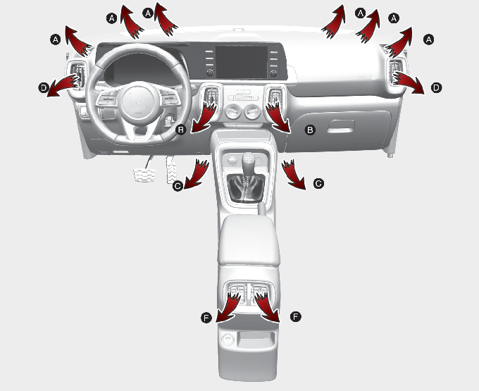 L’essentiel du flux d’air est dirigé vers le sol et le pare-brise, tandis qu'une petite partie est dirigée vers les dégivreurs des vitres latérales et les aérations arrière.