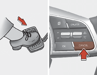 Chacune de ces actions annule le fonctionnement du régulateur de vitesse (la vitesse du régulateur disparaît), mais ne désactive pas la fonction. Pour réactiver le régulateur de vitesse, appuyez sur le contacteur RES+ placé sur le volant. La vitesse présélectionnée est reprise.
