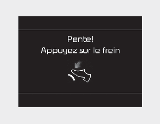 Ce message d'avertissement s'affiche quand le véhicule roule lentement dans une côte et que le véhicule détecte que la pédale de frein n'est pas enfoncée.