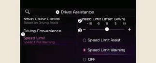 Avec le moteur en marche, lorsque Driver Assistance (Assistance au conducteur) → Speed Limit (Limite de vitesse) → Speed Limit Offset (Décalage de la limite de vitesse) est sélectionné dans le menu Paramètres, le décalage de la limite de vitesse peut être modifié. L'avertissement de limite de vitesse et l'assistance de limite de vitesse fonctionnent en appliquant le réglage « Speed Limit Offset » (Décalage de limite de vitesse) à la limite de vitesse détectée.