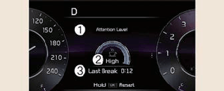Le niveau d'attention du conducteur est affiché sur une échelle de 1 à 5. Plus le niveau est bas, plus le conducteur est inattentif. Le niveau diminue si le conducteur ne fait pas une pause pendant un moment.