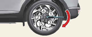 Placez la clé tel qu'indiqué dans l'illustration, puis serrez les écrous de roue. S'assurer que la douille est bien en place sur l'écrou. Ne vous tenez pas debout sur la poignée de la clé et n’utilisez pas un tube de rallonge sur la poignée de la clé. Faites le tour de la roue, serrant tous les écrous jusqu'à ce qu'ils soient tous serrés. Vérifier ensuite deux fois le serrage de chaque écrou. Après avoir changé les roues, faites vérifier le système dans un atelier professionnel. Faire inspecter votre véhicule par un concessionnaire agréé Kia.