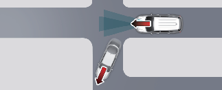 เมื่อรถ (2) เคลื่อนเข้าเลนของคุณจากเลนที่อยู่ติดกัน เซ็นเซอร์จะไม่สามารถตรวจจับรถได้จนกว่าจะอยู่ในช่วงการตรวจจับของเซ็นเซอร์ ระบบควบคุมความเร็วอัจฉริยะอาจตรวจไม่พบรถทันทีเมื่อรถเปลี่ยนเลนกะทันหัน ในกรณีนี้ คุณต้องรักษาระยะเบรกอย่างปลอดภัย และหากจำเป็น ให้เหยียบแป้นเบรกเพื่อลดความเร็วในการขับขี่ของคุณ เพื่อรักษาระยะห่างที่ปลอดภัย