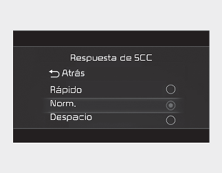 Puede ajustarse la sensibilidad de la velocidad fijada al seguir un vehículo que le precede con el fin de mantener una distancia establecida. Con el interruptor de encendido o el botón ENGINE START/STOP (inicio/parada del motor) en la posición ON (activado), seleccione "Asistencia al conductor → Respuesta de SCC" en el menú "Ajustes Usuario (pantalla LCD)" para configurar una de las tres etapas que prefiera.
