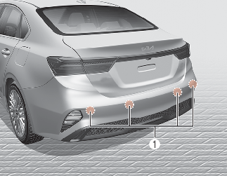 La advertencia de distancia de estacionamiento hacia delante/marcha atrás alertará al conductor mediante un indicador o sonido de advertencia si se detecta una persona, animal u objeto en cierto rango desde los sensores ultrasónicos delantero/trasero (1) cuando el vehículo se mueve hacia delante o hacia atrás a baja velocidad.