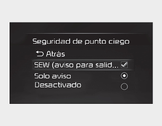 Con el interruptor de encendido o el botón ENGINE START/STOP (inicio/parada del motor) en la posición ON (activado), seleccione "Ajustes Usuario (pantalla LCD) → Asistencia al conductor → Seguridad de punto ciego → Asistencia de salida segura" para activar la advertencia de salida segura y cancelar la selección para desactivarla.