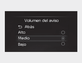 Si modifica el volumen del aviso, es posible que cambie el volumen del aviso de otras funciones de asistencia al conductor. Configure el volumen del aviso después de familiarizarse lo suficiente con su funcionamiento.