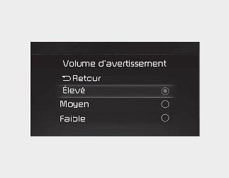 Lorsque le bouton de démarrage/d’arrêt du moteur est en position ON, sélectionnez ‘Driver Assistance → Warning Volume’ dans le menu Réglages pour modifier le volume sonore de l'avertissement sur ‘High (fort)’, ‘Medium (modéré)’, ‘Low (faible)’ ou ‘Off (sourdine)’ de l’avertissement de distance de stationnement en marche arrière.