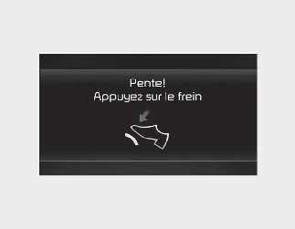 Si le véhicule est retenu dans une côte en appuyant sur la pédale d'accélérateur ou en rampant avec la pédale de frein relevée, l'embrayage et la boîte de vitesses peuvent surchauffer et provoquer des dégâts. Un message d'avertissement s'affiche alors sur l'écran LCD.