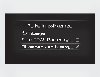 Med tændingskontakten eller MOTORENS START/STOP-knap i tændt position skal du vælge “Brugerindstillinger → Førerassistance → Parkeringssikkerhed” på LCD-displayet eller infotainmentsystemet for at indstille, om hver funktion skal bruges.