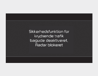 Hvis dette sker, vises advarselsmeddelelsen 'Sikkerhed ved tværgående trafik i bagudgående retning deaktiveret. Radar blokeret' på klyngen. Det er ikke en fejlfunktion.