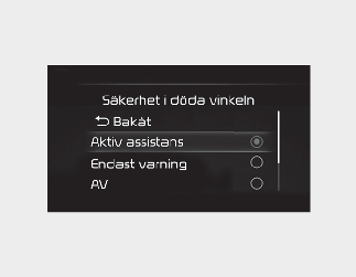 När knappen ENGINE START/STOP är i läget ON ska du välja eller välja bort ”Förarassistans → Säkerhet i döda vinkeln” i menyn Inställningar för att ställa in om du vill eller inte vill använda vissa funktioner.
