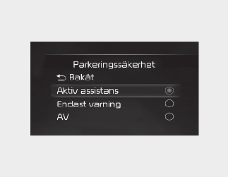 Om ”Rear warning only” (endast varning bak) väljs kommer funktionen att varna föraren när det finns en överhängande risk för kollision med en fotgängare eller ett föremål. Bromsassistans kommer inte att aktiveras.