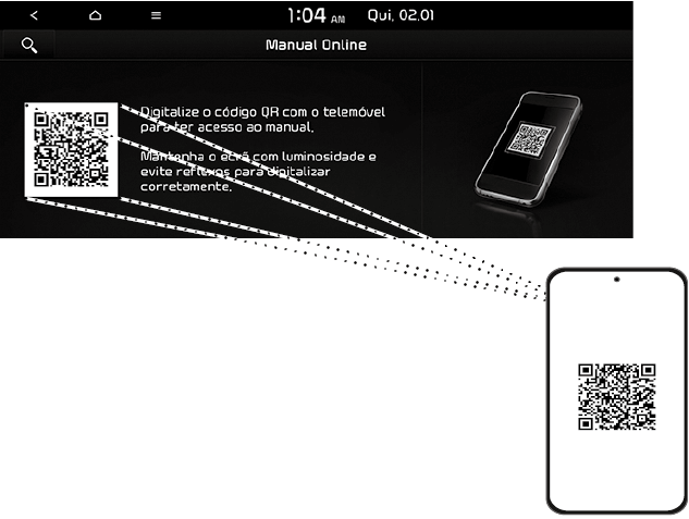 Ao digitalizar o código QR: Pressione [SETUP] > [Geral] > [Informações do sistema] > [Manual Online]. Digitalize o código QR, depois toque no URL do código para aceder a página da web.