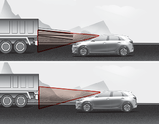 Se o veículo à sua frente tiver uma carga que se projeta para trás a partir da cabina, ou quando o veículo à sua frente tem uma maior distância ao solo, é necessária especial atenção. A Assistência à prevenção de colisão frontal poderá não ser capaz de detetar a carga que sai do veículo. Nestes casos, deverá manter uma distância segura de travagem relativamente ao objeto com a posição mais recuada e, caso seja necessário, manobrar o veículo e carregar no pedal do travão para reduzir a velocidade de condução, de forma a manter a distância segura.